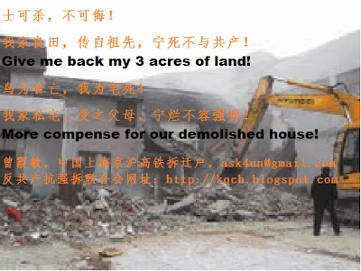 抗强拆联合会理事曾霞敏,近日接连举行抗议行动,通过政治、法律途径,要求中共政权归还强占的15亩祖传良田,赔偿为京沪高铁建设所强拆的700平米祖传私宅。